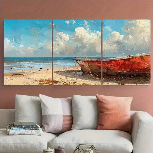 3pcs Lonely Wooden Boat on the Beach Impressionist Metal Print Ready to Hang Art