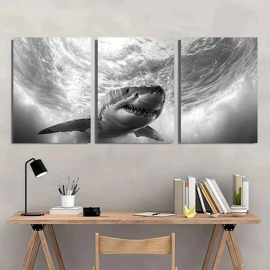3pcs Black And White Shark Underwater Scene Wall Art Set Canvas Framed 40x60cm - High Quality Print 100% Australian Made Wall Canvas Ready to Hang
