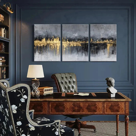 3pcs Set of Abstract Cityscape Golden Highlights Metal Print Ready to Hang Art