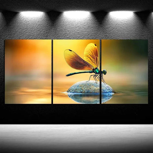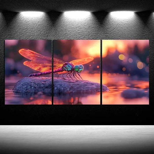 3pcs Dragonflies on the Stone Colourful Metal Print Ready to Hang Art