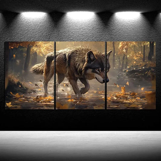 3pcs Majestic Lonely Wolf in Autumn Forest Scene Metal Print Ready to Hang Art