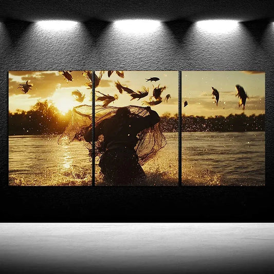 3pcs Fishermen Casting Nets Sunset Metal Print Ready to Hang Art