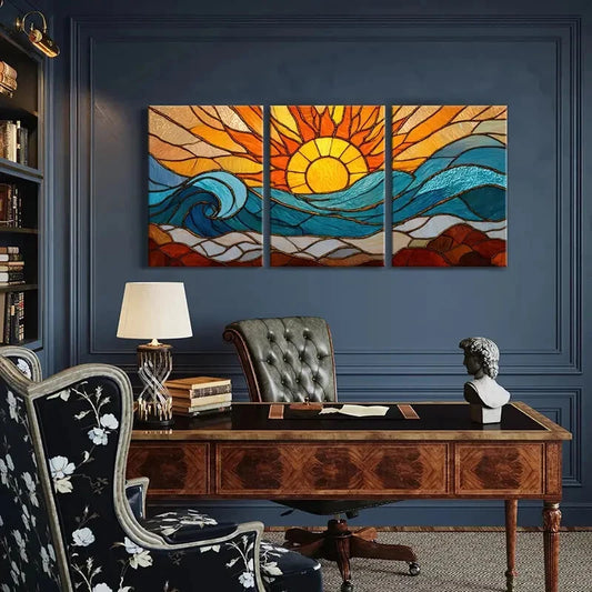 3pcs Stained Glass Sun Ocean Waves Beach Metal Print Ready to Hang Art