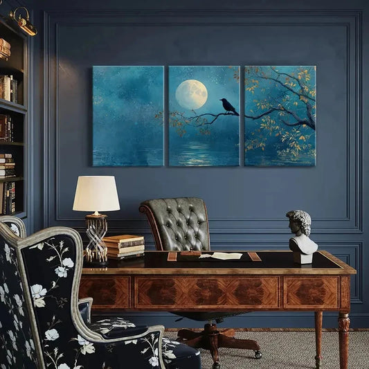 3pcs Moonlit Night Serene Landscape Autumn Leaves Metal Print Ready to Hang Art