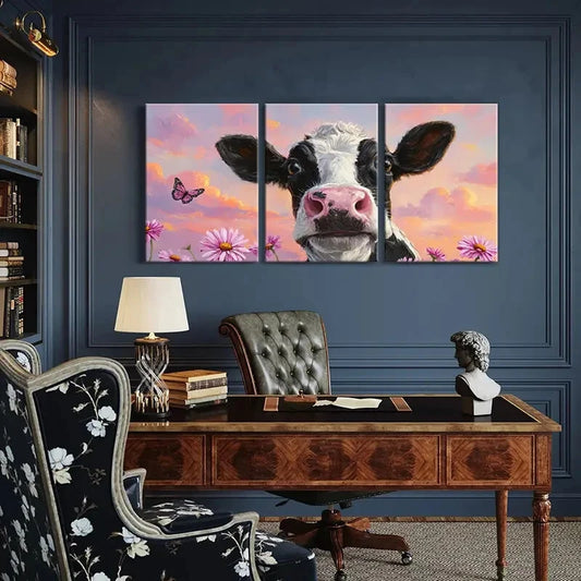 3pcs Cow Portrait Floral Surroundings Soft Pastel Metal Print Ready to Hang Art