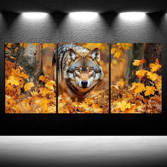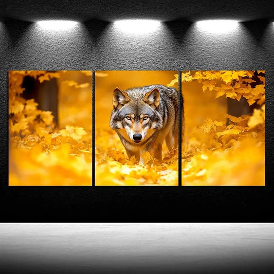 3pcs Majestic Wolf Trio Yellow Forest Metal Print Ready to Hang Art