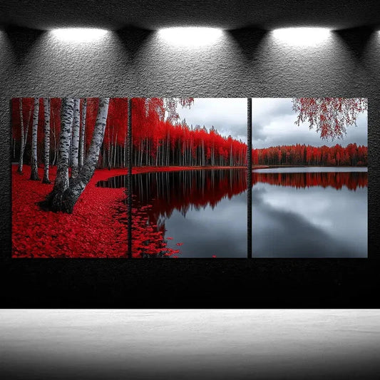 3pcs Autumn Lakeside with Red Poppies Metal Print Ready to Hang Art