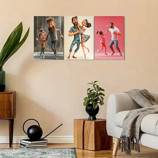 3pcs Cute Illustration Dad & Youngsters Metal Print Ready to Hang Art
