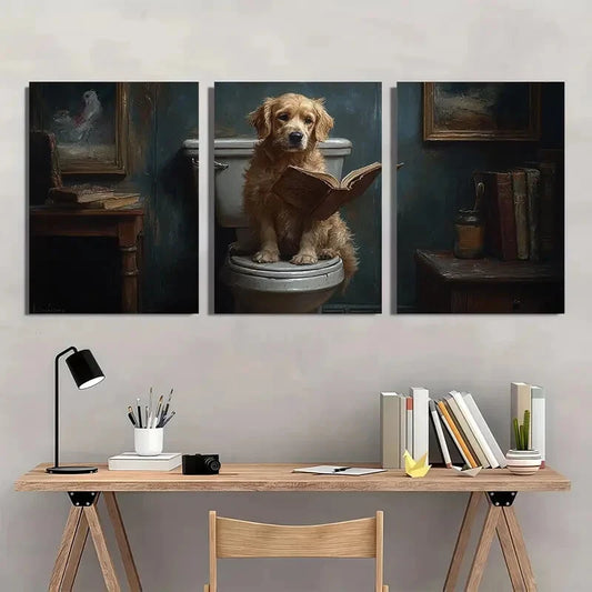 3pcs Whimsical Dog Reading on Toilet Metal Print Ready to Hang Art