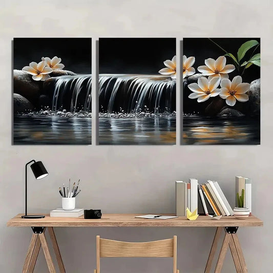 3pcs Serene Bamboo Plumeria Flowers & Waterfall Metal Print Ready to Hang Art