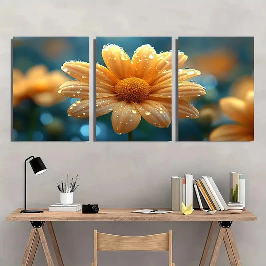 3pcs Vibrant Daisy Blue Water Drops Metal Print Ready to Hang Art