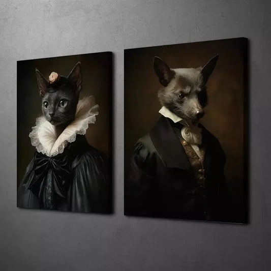 2pcs Black Cat & Bat Gothic Renaissance Portrait Canvas Framed 50x75cm - High Quality Print 100% Australian Made Wall Canvas Ready to Hang