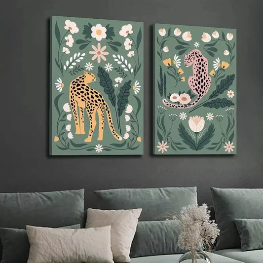 2pcs Decorative Painting, Cheetah, Feline, Floral Botanical Canvas Framed 50x75cm - High Quality Print 100% Australian Made Wall Canvas Ready to Hang