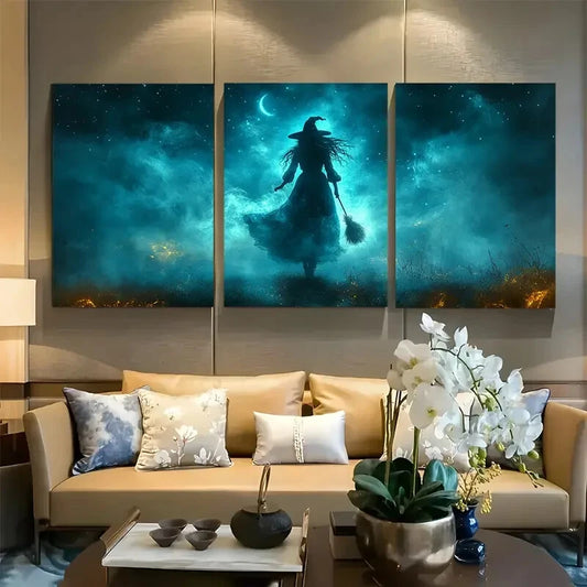 3pcs Witch on a Broom Flying Through Night Sky Metal Print Ready to Hang Art