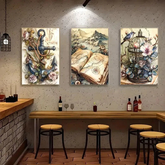 3pcs Vintage Nautical & Floral Decor Wall Art Metal Print Ready to Hang Art