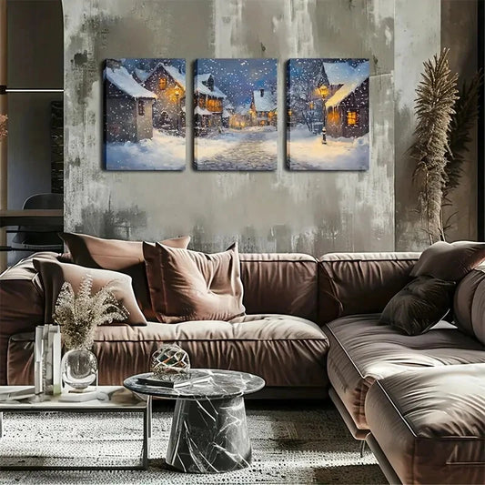 3pcs Snowy Village Scene with Warm Lights Metal Print Ready to Hang Art