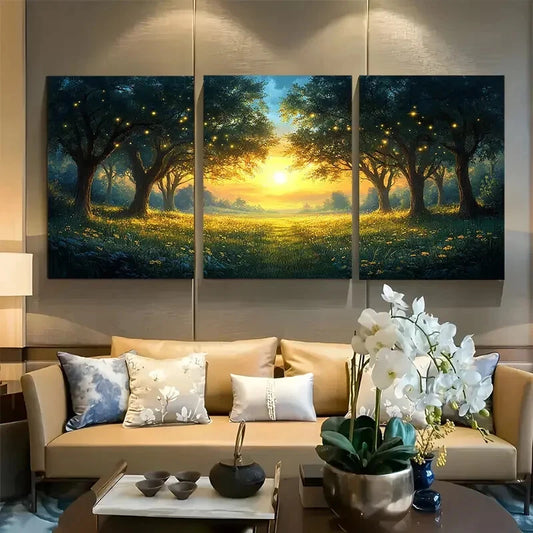 3pcs Magical Moonlit Forest Glade Engulfed Firefly Metal Print Ready to Hang Art