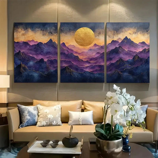 3pcs Purple Mountains and Golden Sunset Metal Print Ready to Hang Art