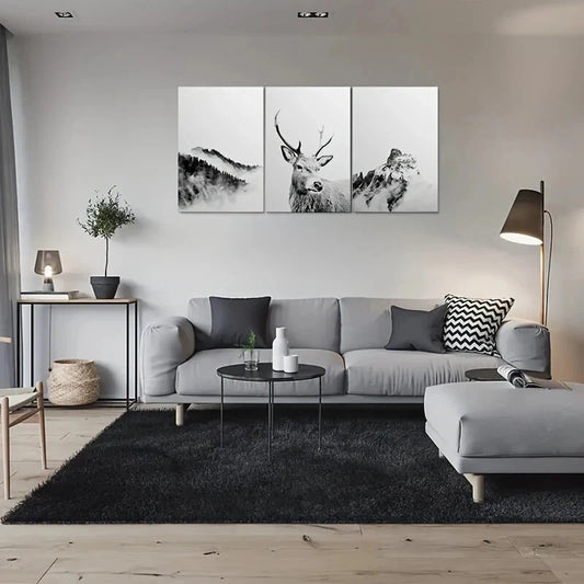 3pcs Black and White Deer with Mountain Metal Print Ready to Hang Art