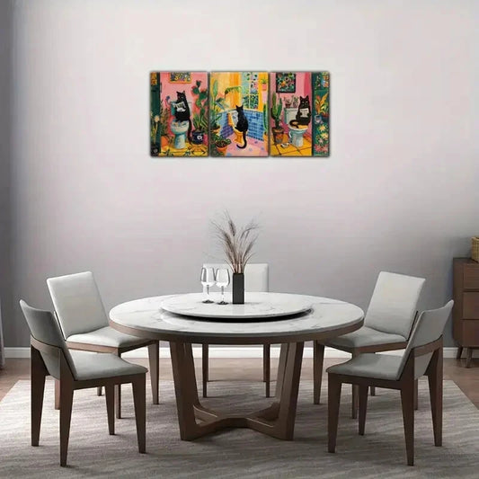 3pcs lack Cat on Toilet Oil Painting Fun Bathroom Metal Print Ready to Hang Art