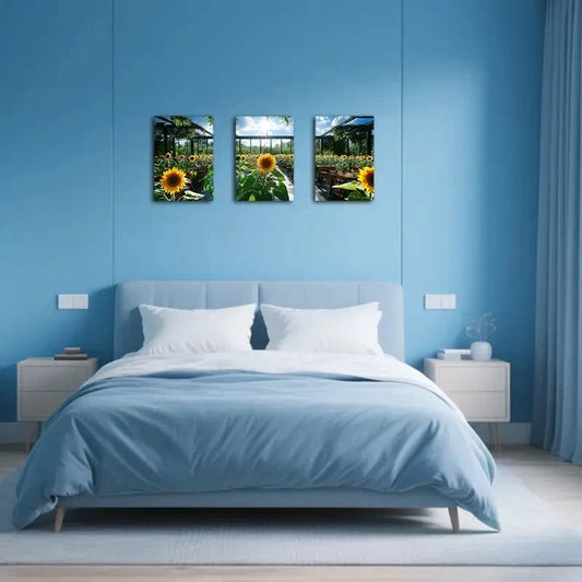 3pcs Abstract Sunflower & Greenery Balcony Scene Metal Print Ready to Hang Art