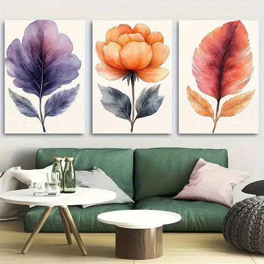3pcs Minimalist Peony and Feather Watercolor Metal Print Ready to Hang Art