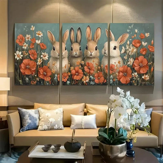 3pcs Whimsical Bunny Rabbit Family with Florals Metal Print Ready to Hang Art