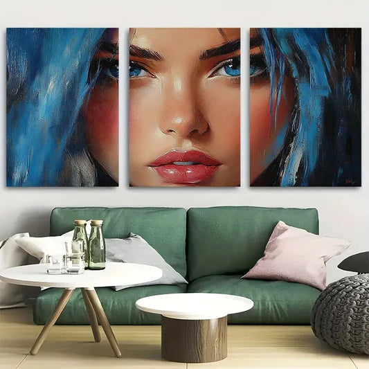 3pcs Vibrant Abstract Woman with Blue Hair Metal Print Ready to Hang Art