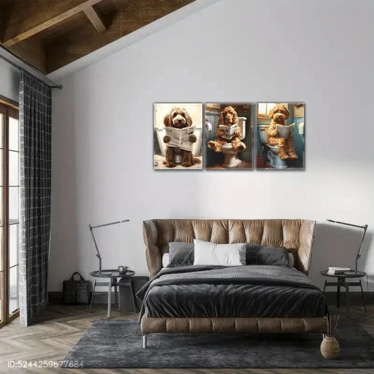 3pcs Cute Dog Reading Newspaper on Toilet Metal Print Ready to Hang Art