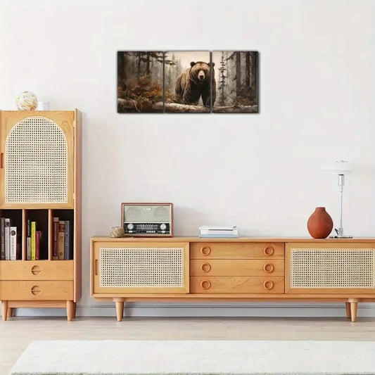 3pcs Grizzly Bear in Foggy Forest Animal Portrait Metal Print Ready to Hang Art