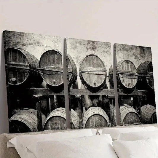 3pcs Wine Barrels Stacked in a Vintage Winery Wall Art Set Canvas Framed 40x60cm - High Quality Print 100% Australian Made Wall Canvas Ready to Hang