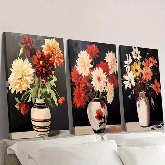 3pcs Colorful Red Orange White Flowers in Vases Wall Art Set Canvas Framed 40x60cm - High Quality Print 100% Australian Made Wall Canvas Ready to Hang