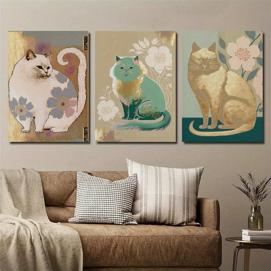 3pcs Furry Cats in Floral & Abstract Designs Metal Print Ready to Hang Art
