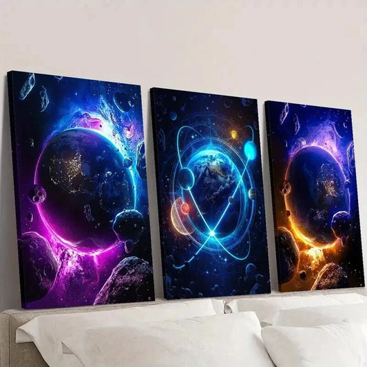 3pcs Fantasy Outer Space Glowing Planet Wall Art Set Canvas Framed 40x60cm - High Quality Print 100% Australian Made Wall Canvas Ready to Hang