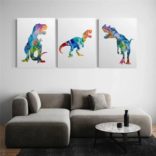 3pcs Colorful Watercolor Dinosaur Vibrant Metal Print Ready to Hang Art
