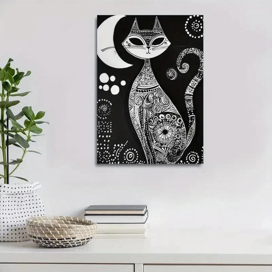 Bohemian Black and White Cat Moon Painting 40x60cm Metal Print Ready to Hang