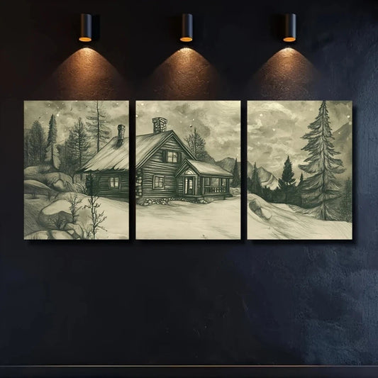 3pcs Snowy Mountain Cabin Scene Metal Print Ready to Hang Art
