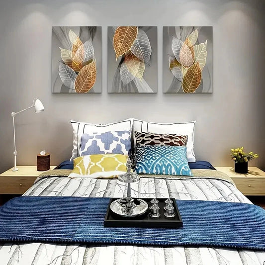 3pcs Modern Abstract Leaf Golden Blue and Gray Metal Print Ready to Hang Art