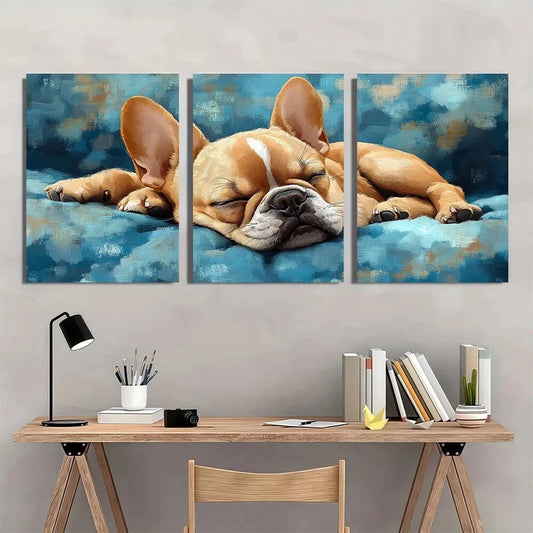 3pcs Bulldog Sleeping on the Bed Line Metal Print Ready to Hang Art