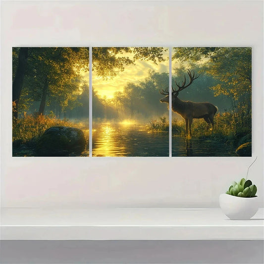 3pcs Red Deer Forest Canvas Wall Art Set Metal Print Ready to Hang Art