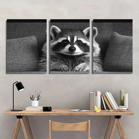 3pcs Modern Black and White Raccoon Metal Print Ready to Hang Art