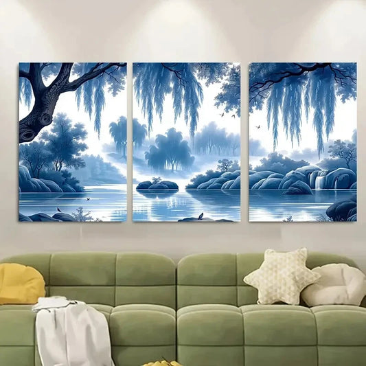 3pcs Willow Tree River Blue Chinoiserie Art Metal Print Ready to Hang Art