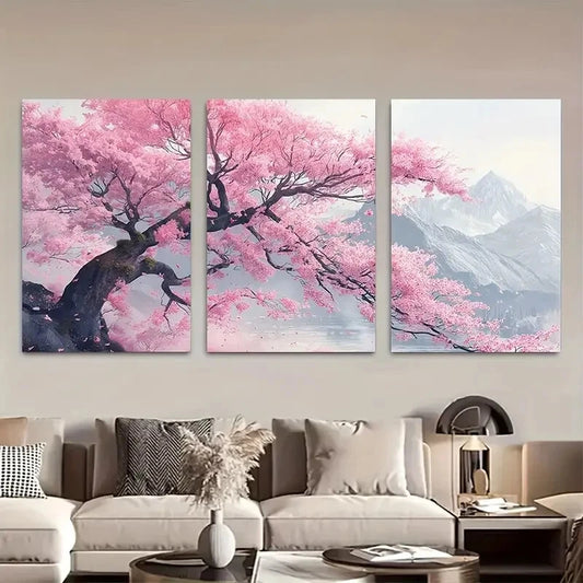 3pcs Cherry Blossom Tree & Mountain Scenery Metal Print Ready to Hang Art