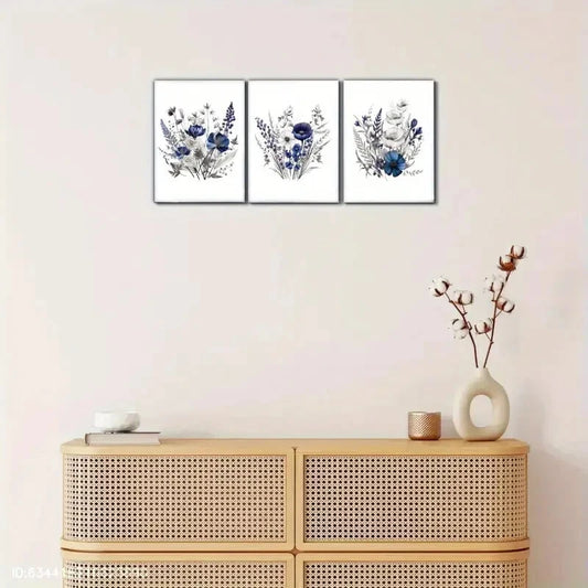 3pcs Botanical Print Navy Blue Floral Wall Decor Metal Print Ready to Hang Art
