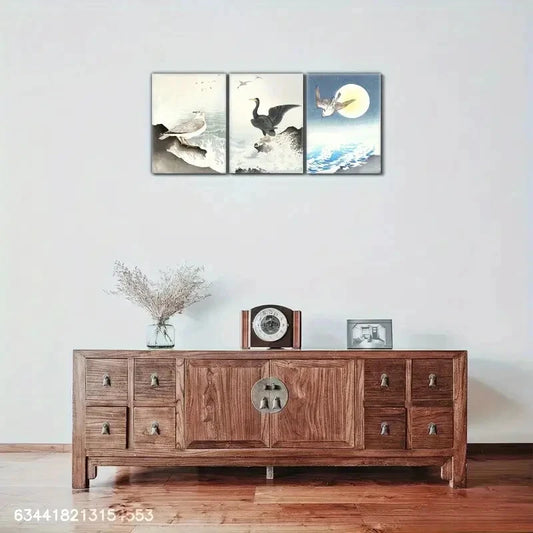 3pcs Japanese Crane Traditional Sumi e Design Metal Print Ready to Hang Art