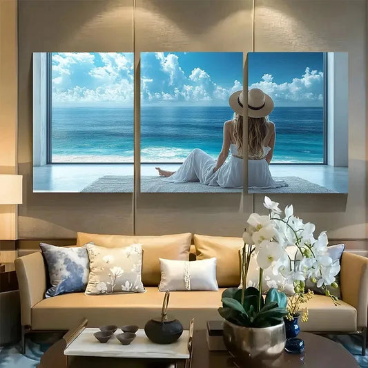 3pcs Serene Beach Scene with Woman in Hat Design Metal Print Ready to Hang Art
