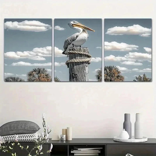 3pcs Pelican with Blue Sky & Palm Trees Wall Art Set Canvas Framed 40x60cm - High Quality Print 100% Australian Made Wall Canvas Ready to Hang