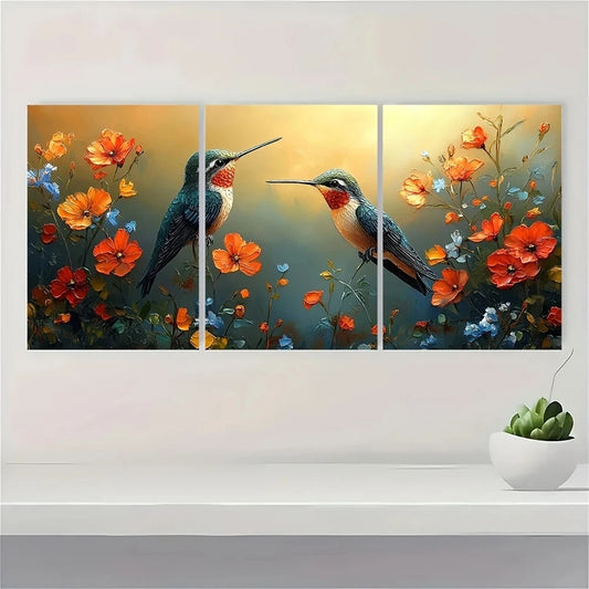 3pcs Hummingbirds and Colorful Flowers Metal Print Ready to Hang Art