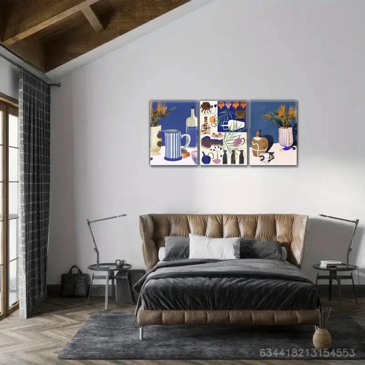 3pcs Elegant Tea Cups Teapots Flowers Vases Metal Print Ready to Hang Art