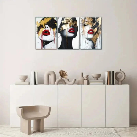 3pcs Red Lips Sexy Woman Golden Decoration Metal Print Ready to Hang Art